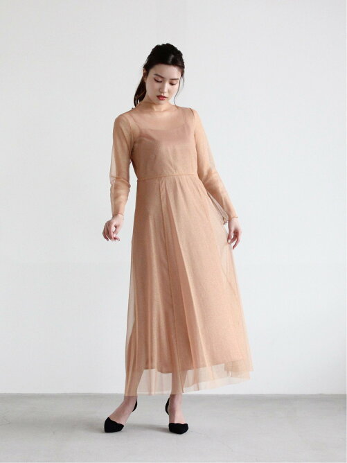Sneepdip スニープディップ ラメロングワンピース ワンピース ワンピ キラキラ ラメ お人形 無地 長袖ワンピ 長袖 フリルロング丈 ミモレ丈 ひざ下 シアー 透け バックリボン チュール フリル かわいい ひらひら シャーリング 春夏 渋谷109ゴージャス 品番 Ashw