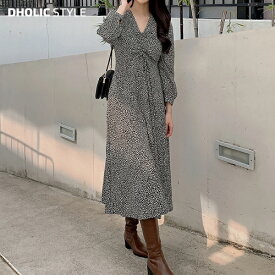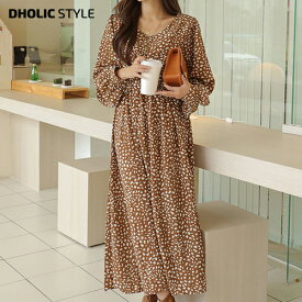 ワンピース ダルメシアン柄ワンピース アニマル柄 ダルメシアン 柄 ドット ヒョウ柄 レオパード ロング ミディミモレ ウエスト ギャザー 長袖 スカート モノトーン 白黒 品番 Gw Growing Rich グローウィングリッチ のレディースファッション通販
